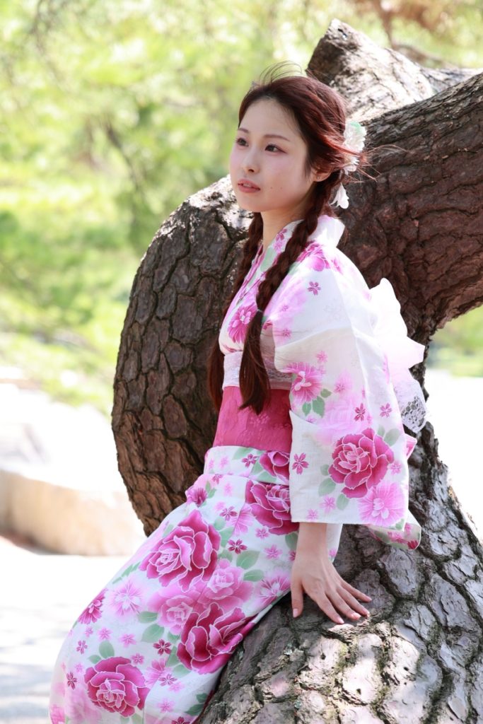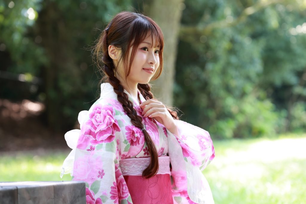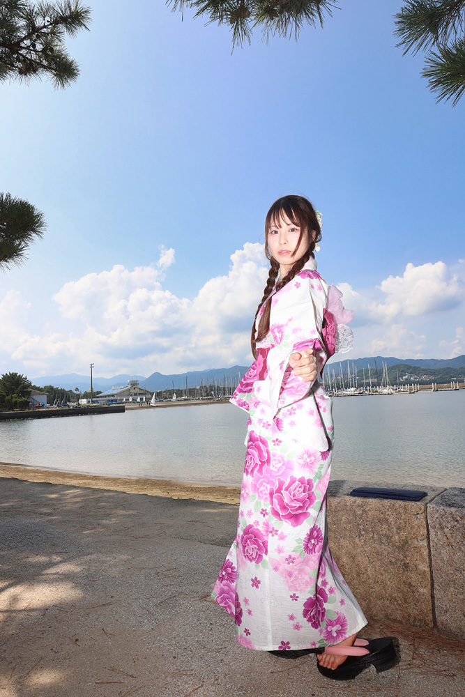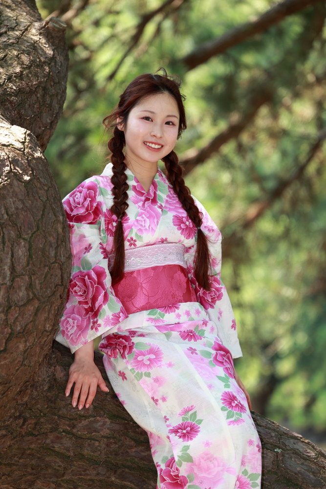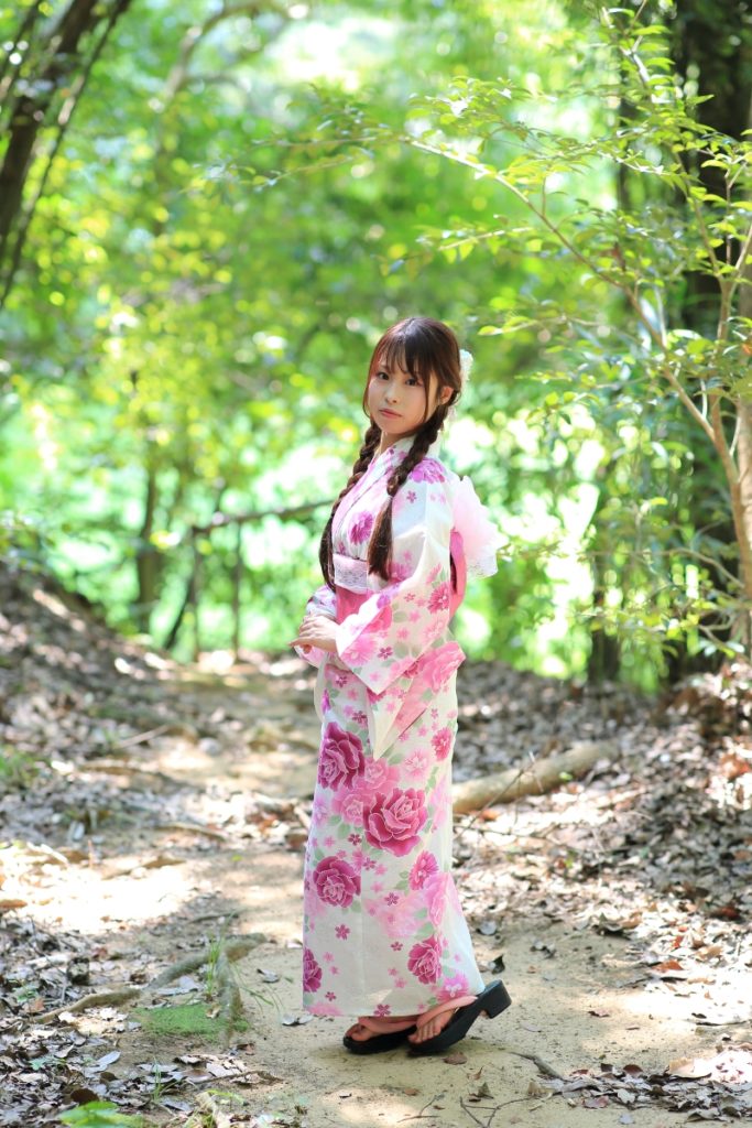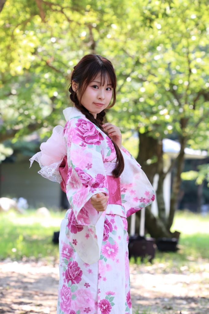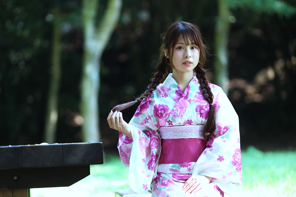 福岡市・小戸公園で開催された浴衣ポートレート撮影会。出演モデル『まな』が夏の午前光の中で涼やかな表情を見せる一枚。