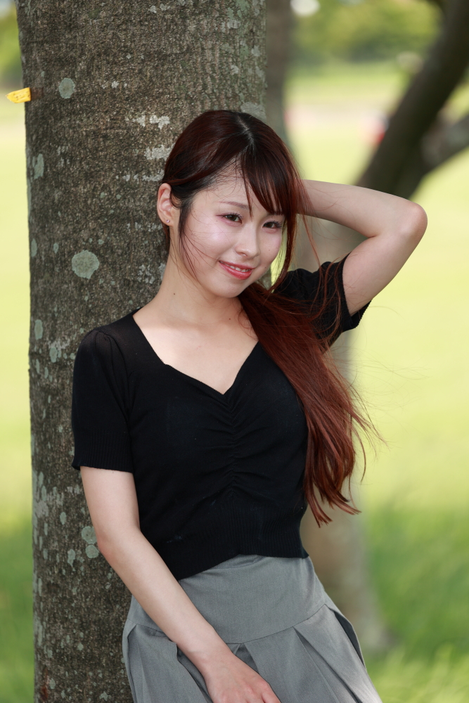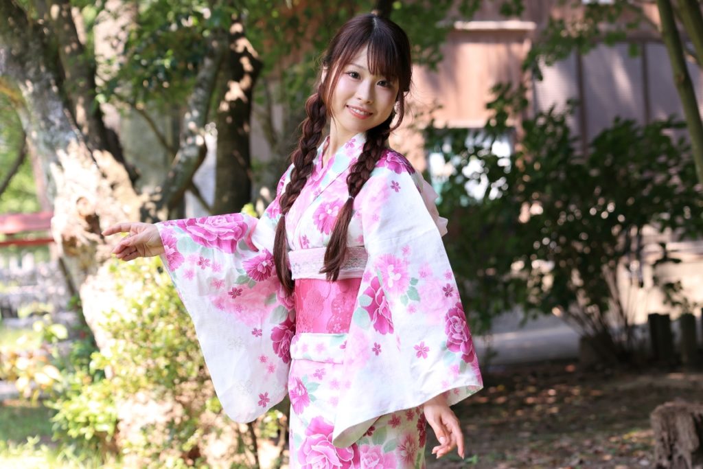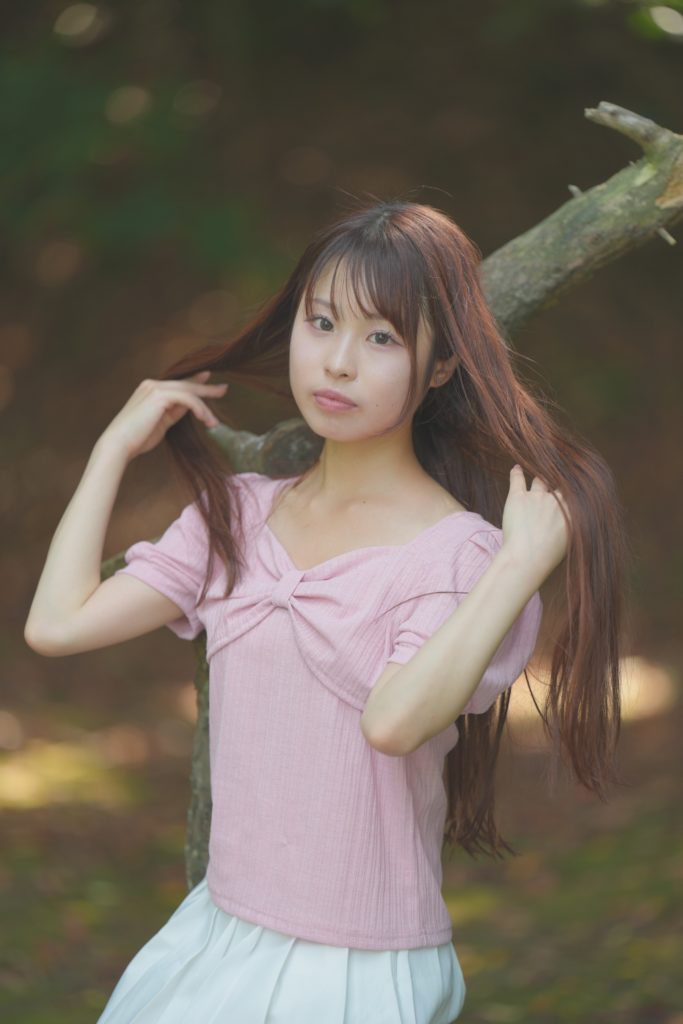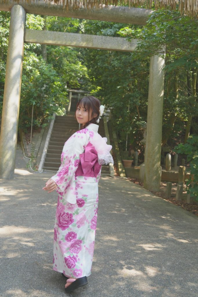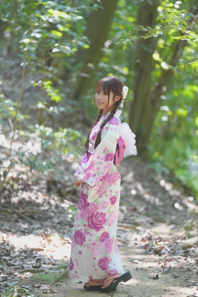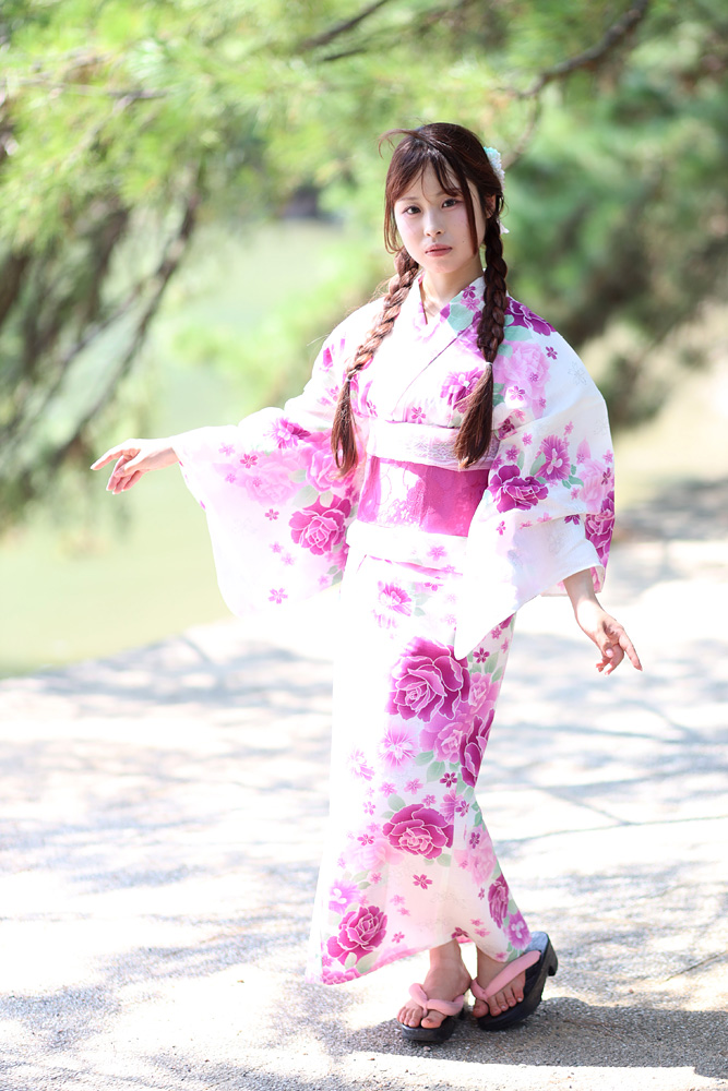 福岡市・小戸公園で開催された浴衣ポートレート撮影会。出演モデル『まな』が夏の午前光の中で涼やかな表情を見せる一枚。